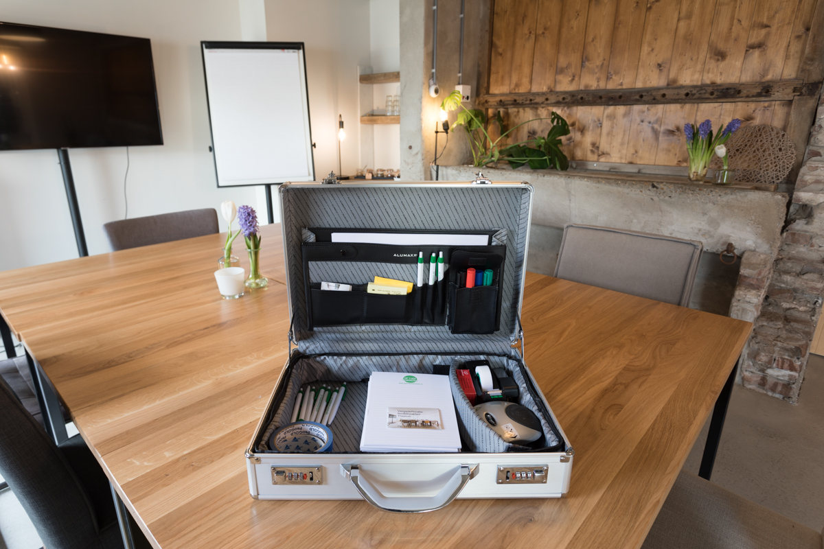 (smart)TV scherm, een flipover en een compleet ingerichte vergaderkoffer.
